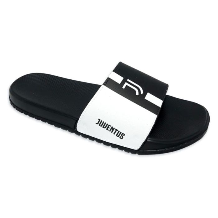 JUVE CIABATTE FASCIA DA ADULTO, ADATTE PER IL MARE O LA PISCINA, COLORE BIANCONERA CON LOGO UFFICIALE 'JUVENTUS FC' SULLA FASCIA. LATERALMENTE E' STAMPATA LA SCRITTA 'JUVENTUS' A CONTRASTO.