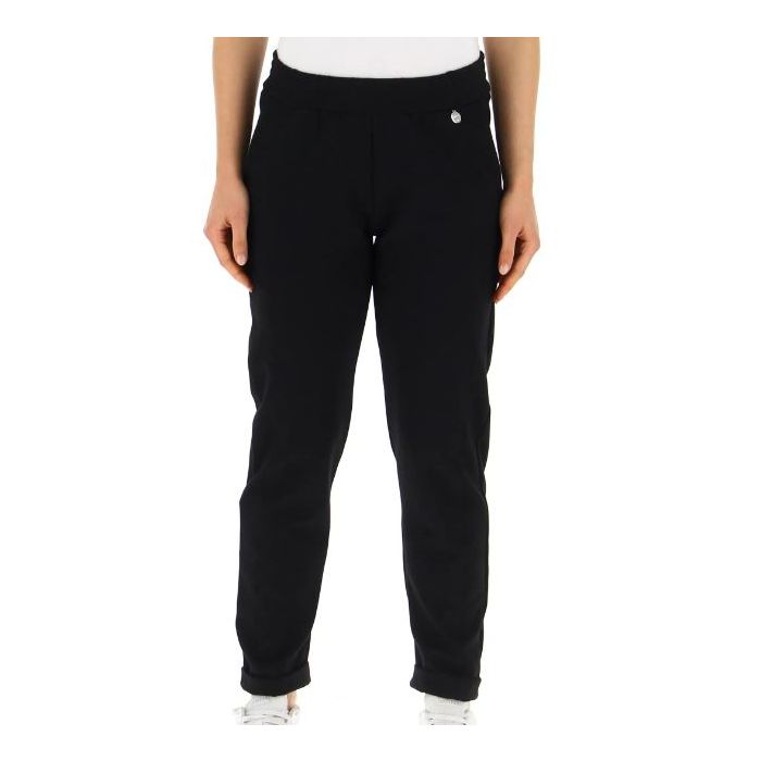 Pantalone in misto viscosa con fascia in vita elasticizzata, fondo gamba con risvolto cucito, due tasche frontali e due finte tasche sul retro con etichetta logo, interno garzato liscio