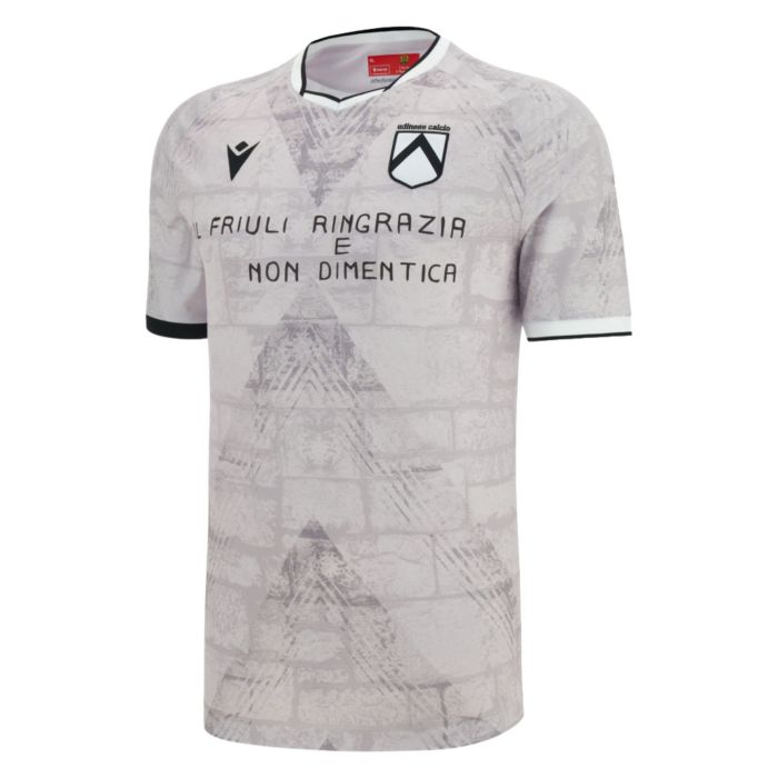 una creazione che unisce tecnologia avanzata e simboli storici. Questa maglia away è caratterizzata da una texture sublimata che evoca la forza e la tradizione, con il potente messaggio "Il Friuli ringrazia e non dimentica" stampato.
