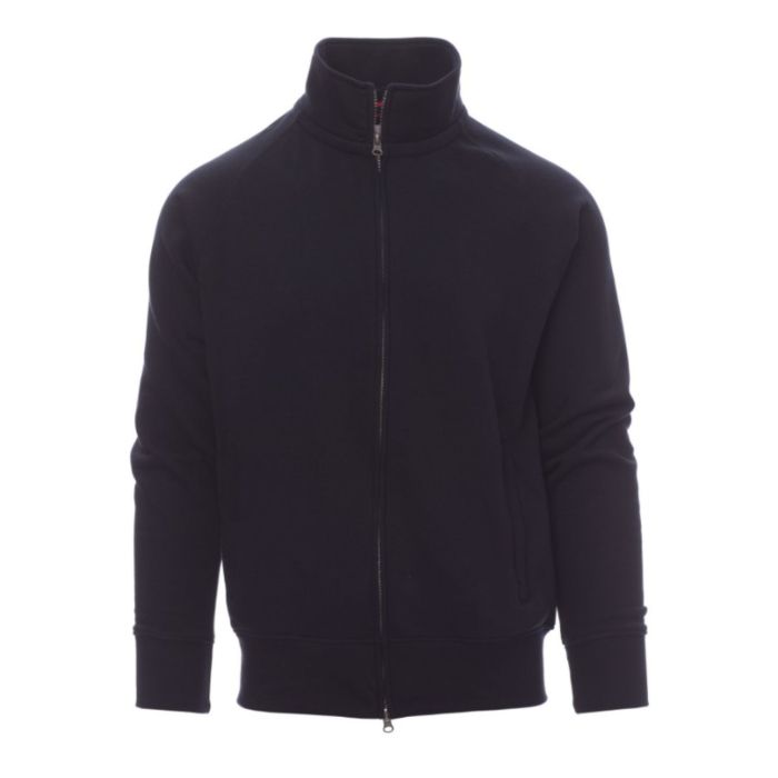 Felpa da uomo, zip intera SBS coperta, in plastica con doppio cursore in metallo, manica raglan, due tasche con zip coperte, polsini e vita in costina elasticizzata, cuciture rinforzate.