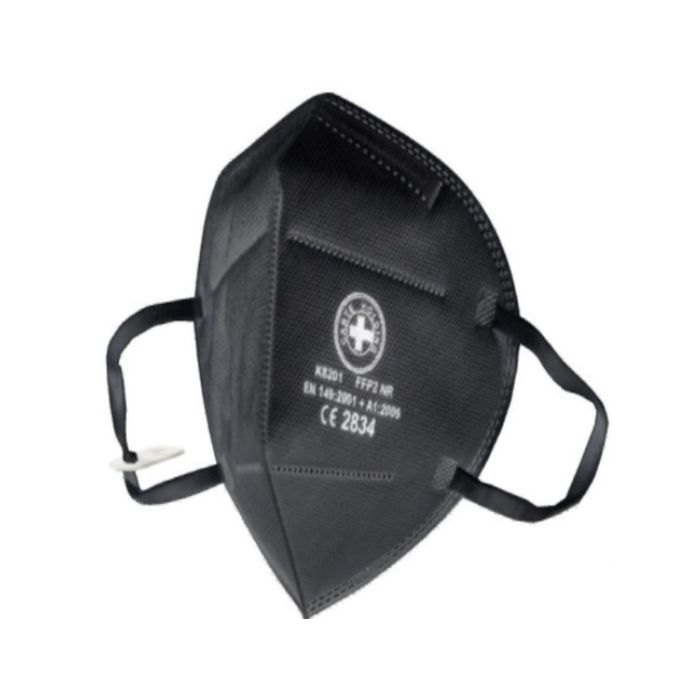 Semimaschera facciale filtrante antipolvere FFP2 NR, pieghevole, con ferretto (o nasello) al naso ed elastici con gancio per allaccio dietro nuca.