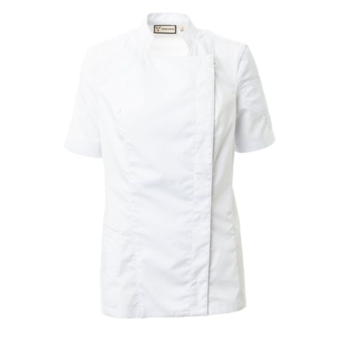 Giacca da chef con collo alla coreana, realizzata in ripstop di cotone e Lycra® T400®, con ottime proprietà elastiche e traspiranti, e con confortevole tessuto a rete su schiena, per amplificare la traspirazione. Chiusura a doppio petto con bottoni automatici, lembo ripiegabile e fissabile al petto mediante allaccio ad un bottone a vista, che crea l’effetto di un bavero sartoriale e di un innovativo scollo a V. Manica corta con orlo. Iconica toppa sagomata sulla spalla sinistra, con ricamo ad elica tono su tono, provvista di taschino porta penne. Pratica tasca porta smartphone in vita.